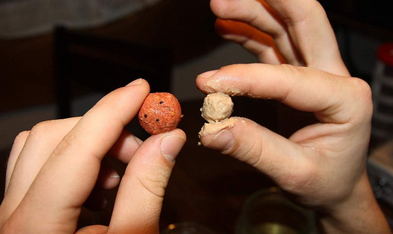 Moje snaha byla vyrobit boilies s postupnou dobou rozpadu cca 8 hod za předpokladu, že boilies se bude postupně odbalovat (rozpouštět, ale střed zůstane pořad soudržný). Víceméně se bude pouze zmenšovat průměr chytacího boiliesu nastraženého na vlasovém přívěsu. Vyrobit takové boilies není úplně jednoduché. Po určitých nezdařených pokusech vyrábím pouze základní tři druhy boiliesu, a to na bázi rybích mouček, ptačích zobů s ovocnou příchutí a na klasické bázi játra – maso.