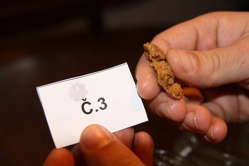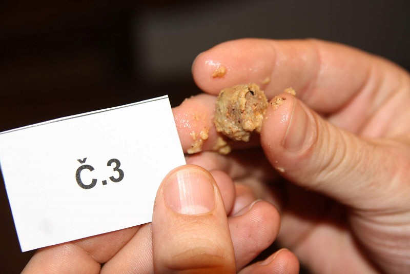 Boilies č. 3 – boilies naší vlastní tvorby, u kterého jsem byl spokojen s rychlým nástupem odbalování po 30 minutách. Ale narazili jsme na problém s nesoudržným středem po 60 minutách.