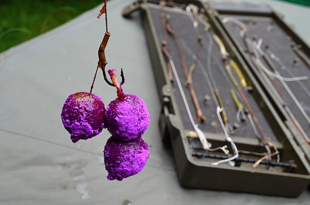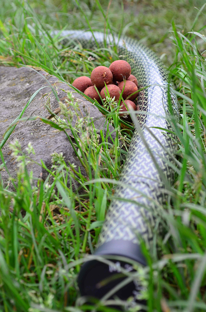 Přidával jsem PVA stužku s jednou nebo dvěma kuličkami boilies. To proto, aby se snížila možnost zamotání. Samozřejmě to plní i funkci mírného zatraktivnění a přikrmení. Do záběru tam jsou dvě kuličky navíc, které mohou přilákat kapříka. Po záběru již předpokládám, že kuličky jsou pryč. A zůstala jen část krmného koberce z method mixu.