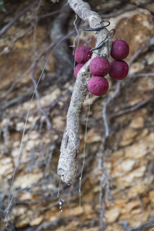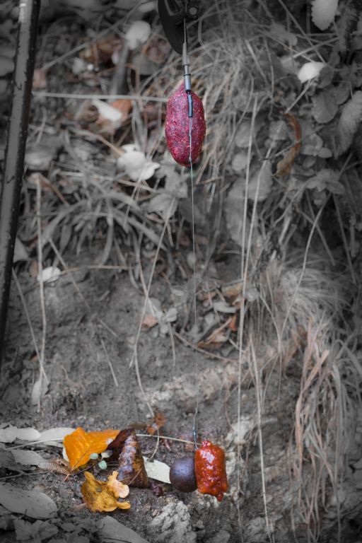 Těmi podpůrnými prostředky byla tři samostatně fungující dráždidla. Zaprvé směs do PVA Rektor Meat. Jedná se o pružnou hmotu s hrubou strukturou, kterou jsem namačkal na povrch olova. Tato směs se ve vodě uvolňuje nepoměrně pomaleji než další popisované atraktory. Směs do PVA dokáže vydržet dle místních podmínek 2-5 hod. Zadruhé obalovačku jsem namodeloval jak jinak, než na nastraženou kuličku boilies. Ta dokáže vytvářet atraktivní zónu okolo mé montáže cca 1-3 hod. Samozřejmě jsem zvolil příchuť oliheň.