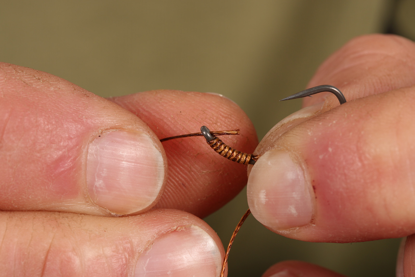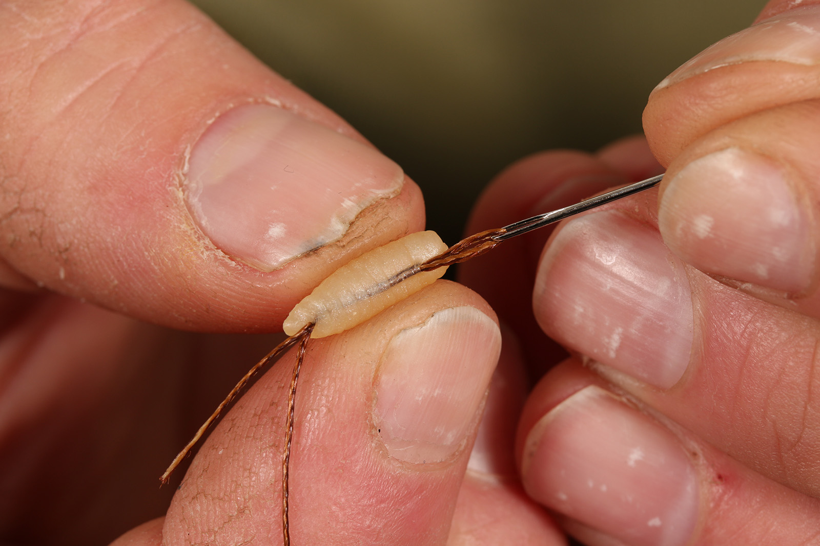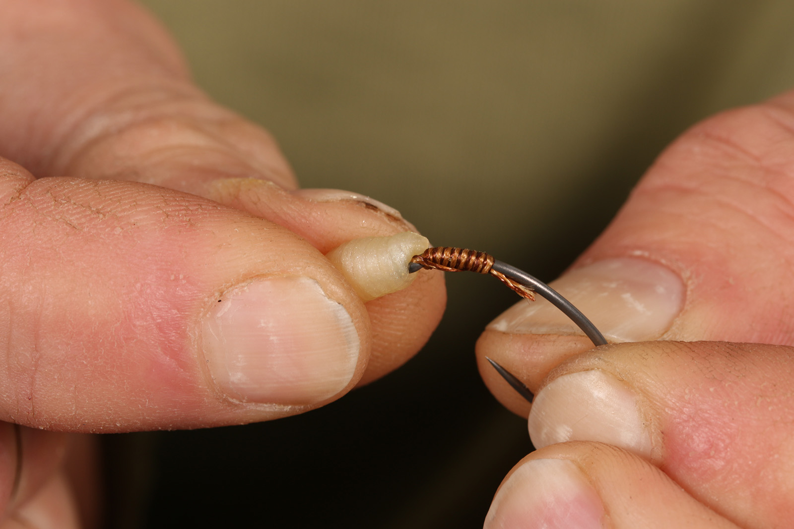 Co by to bylo za návazec bez pořádné návazcové šnůry. Pro tuto příležitost jsme použili Trickster Heavy, která je super jemná a nesníží a nezpomalí průběh nasávání. Také nehrozí zamotání háčku do návazce díky koncovému připevnění háčku za PVA Micromesh sáček. Háček zasekněte do PVA sáčku zhruba v jeho druhé třetině – tedy tak, aby byl více nalevo. Díky tomu se háček neutrhne od PVA sáčku při drsnějším dopadu.