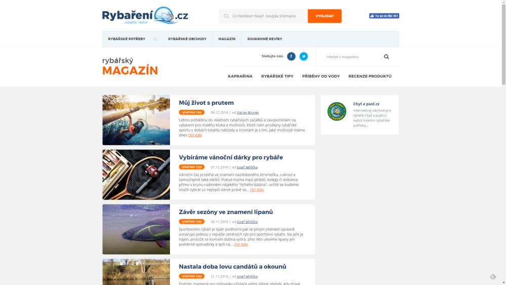 Přibližně před měsícem byl spuštěn nový ambiciózní web pro rybáře – Rybaření.cz, který si klade za cíl rybářům usnadnit orientaci při výběru a nákupu rybářských potřeb na internetu. Stránky Rybaření.cz jsou spolehlivým průvodcem ve světě rybářského vybavení, věnují se srovnání cen českých internetových obchodů, sledují novinky v technice lovu i rybářském světě vůbec a přinášejí zajímavé tipy pro každého, kdo se našemu nádhernému sportu věnuje. Kromě toho na stránkách návštěvník najde i také rybářský magazín.