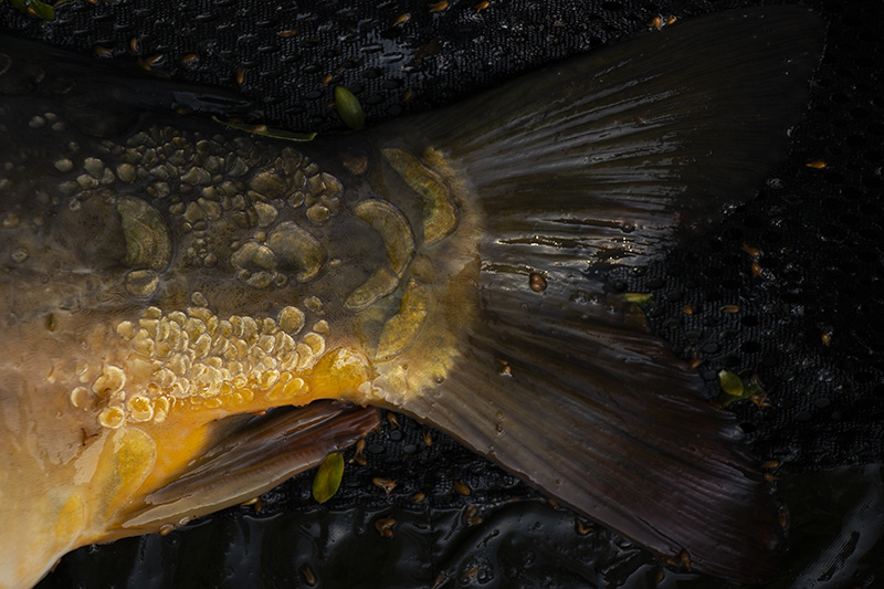 Nemusím vám teď snad ani popisovat, kdy přišel očekávaný záběr. Samozřejmě v tom nejlepším! Možná bych to měl už čekat a spát rovnou v pláštěnce. Opět startuju k prutu a opět stejný průběh. Jeden strom, druhý strom, prut do písmene “U”. Jsem během minuty totálně durch a ryba lítá z překážky do překážky. Tentokrát je to opravdu bojovník, ne a ne dostat ho ke břehu. Jediné, co jsem zatím zahlédl, je fakt, že je to šupináč a jeho ocasní ploutev, kterou mi dává pěkně na frak. Od podběráku mi jede tak desetkrát a vždy musím lehce pustit brzdu, jinak bych ho upálil, tyhle výpady nakrátko už mým Horizonem nevykreju. Nakonec se unavuje a já ho podebírám. Šupík je opravdu krásně stavěný, i přes svých šest kilo to je pořádný divoch.