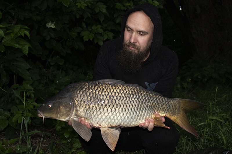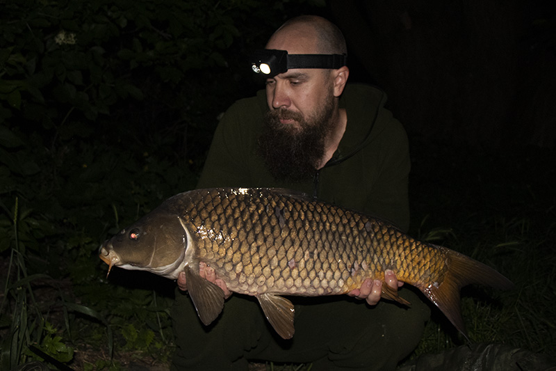 Dle Michala přehnaně riskuji, ale já své strategii věřím a montáž posílám opravdu na krev, sotva metr od spadlého stromu. Brzdy na doraz a pruty co nejblíže přístřešku, na pruty chci dosáhnout takřka z lehátka. Druhý prut s podobnou montáží jen šňůrkou Coretex Matt 25lb osazuji nakonec kuličkou Equinox, kterou mám již nějaký ten měsíc naloženou v Liquidu Hot Chorizo, a jen tak samotnou, samozřejmě opět zajištěnou PVA punčoškou, ji posílám k druhému břehu. Na místo ke stromu ještě nakobruju zhruba dvě hrsti Pacifika a totálně unavený si jdu lehnout. Je deset hodin a já jsem tak unavený, že neudržím oči. Na chvilku přemýšlím, že půjdu pruty opět stáhnout, neboť do půlnoci nevydržím a za dvě hoďky stejně nic nepřijde. Pomalu se rozhoduji a odhodlávám a právě v tu chvíli se mi rozjede levý prut, prut od stromu. Rozjede je trochu silný výraz, signalizátor sice svítí a možná si i jednou pípnul, ale brzda na krev zajistí pouze ohnutí prutu jak luk. Rychle zvedám prut a bez navíjení couvám směrem od stromu a prut držím v krásné parabole. Po pár výpadech ve větvích stromu ryba překážku opouští a já ji dostávám na volnou vodu. Tah je silný a plynulý, velikost ještě nedokážu odhadnout, ale už teď cítím, že se chová trochu divně. Která ryba by se však nechovala divně v takovéto mělčině plné bahna? U podběráku však zjišťuji ve světle čelovky pravou příčinu. Pacific zachutnal skoro metrovému sumci. Když už mám prut venku, tak opět přemýšlím, jestli ho jen neopřít, nevyndat i druhý a nejít spát. Beztak tam již sumíci vše vyluxovali. Nakonec se přemáhám a posílám prut zpět a už nyní vám mohu prozradit, že dělám dobře. Půl hodiny po náhozu, lehce po 23 hodině, přichází další záběr na stejný prut a už podle souboje vím, že teď už to je kapr a rozhodně ne malý. Tah je plynulý a silný, ryba mi podjíždí pod nohama a já stále ještě nevidím, s kým mám tu čest. Po pár razantních akcích mi nakonec zajíždí do stromu u mého břehu, naštěstí jsou větve pouze na hladině a já ho se špičkou u dna vyvádím ven. Konečně ho vidím. Krásný dlouhý šupináč, ve tmě pouze za svitu čelovky nedokážu odhadnout váhu, ale 7 kg má určitě. Moc pěkný úlovek za tak krátkou dobu na takto složité vodě.
