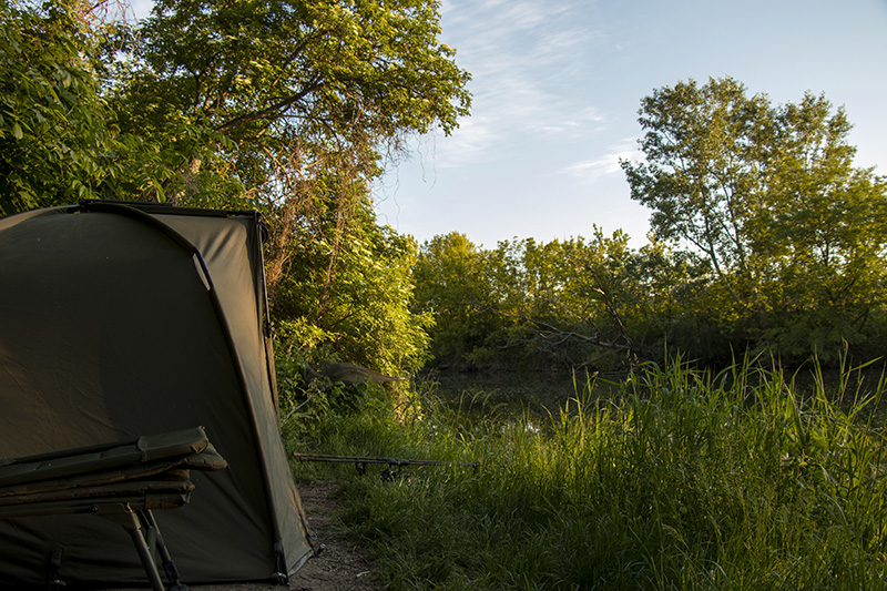 K vodě dorážíme dosti v podvečer a značně znaveni. Místo, na které jsme si dělali zálusk, je dle očekávání prázdné a můžeme tedy chystat zázemí. Během chvilky už popaměti a možná i trochu strojově stavíme přístřešky a chystáme pruty. Až teď, když nad tím přemýšlím, tak se musím pousmát nad systémem, který mám již mnoho let zažitý. Vše stavím stále stejně, vždy ležím stejně a každý kousek výbavy je vždy na stejném místě. Mám to takto prostě rád a má to svou logiku, takto uspořádaný systém mi usnadní práci ve spěchu a ještě více potmě.