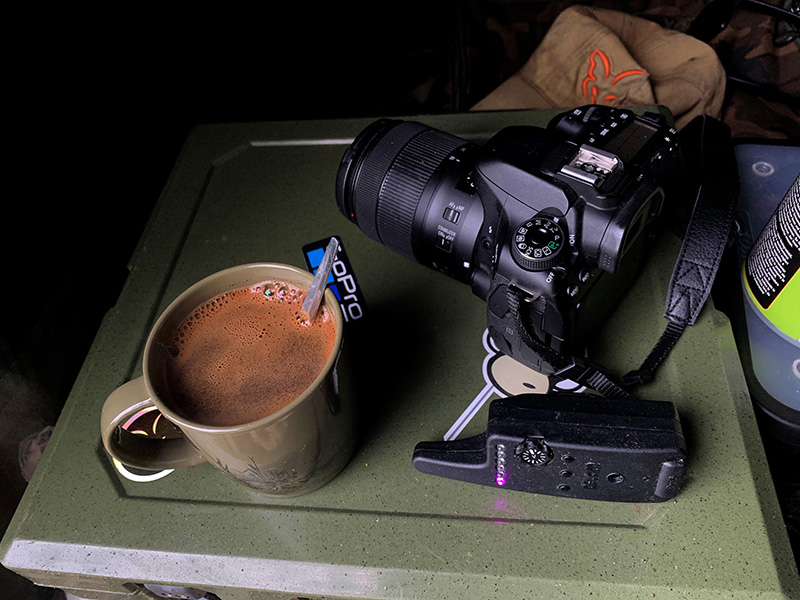 Se soumrakem přichází jemný déšť a já tu s tabletem v ruce píšící on-line tento článek čekám na noční rybu. Před chvilkou jsem měl padák na pravém prutu, ale ryba už tam nebyla. Sedím a poslouchám kapky dopadající na střechu svého bivaku a po očku sleduji izotopy v indikátorech, zda se nepohnou. Máme před sebou ještě hodinu lovu. Ze všech stran se ze tmy ozývají zvuky ryb. Něco kapři a velká část sumci. Doufám, že ještě něco přijde.