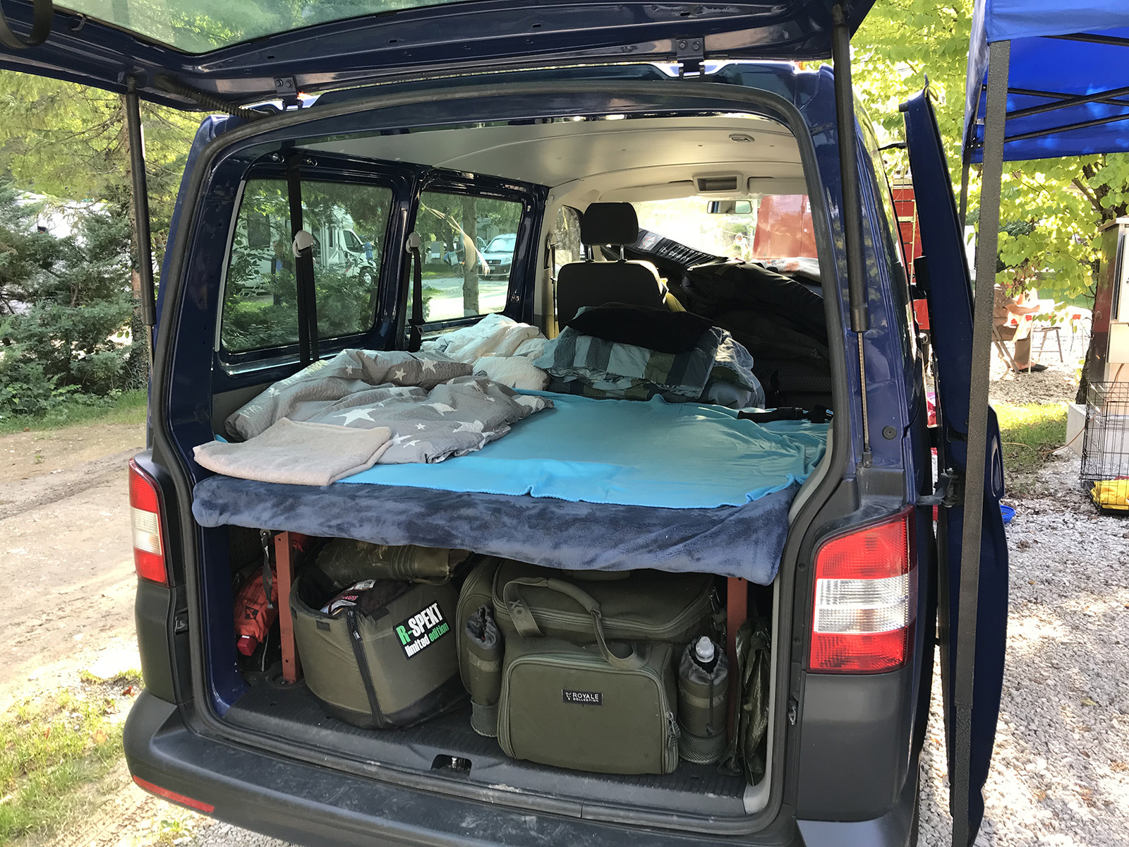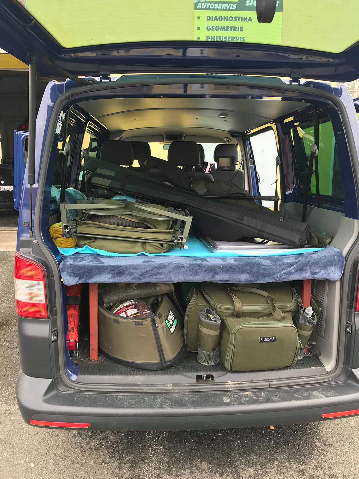 Usínám asi jen na hodinu. Budík zvoní. Rychle skládám vozíček a nakládám všechny věci. Při nakládání posledních věcí kolem mě projede někdo s vozíčkem. Říkám si: „Sakra, ten je rychlej“ a doufám, že nebude sedět na mém místě. Vyrážím k vodě. Vozík od Trakkeru sedí výborně i při maximálním nákladu. Ovladatelnost je taky skvělá. Potichu přijíždím na místo, ale kousek vedle už někdo vybaluje. Je to onen kluk, co vyjel o minutu dřív než já.
