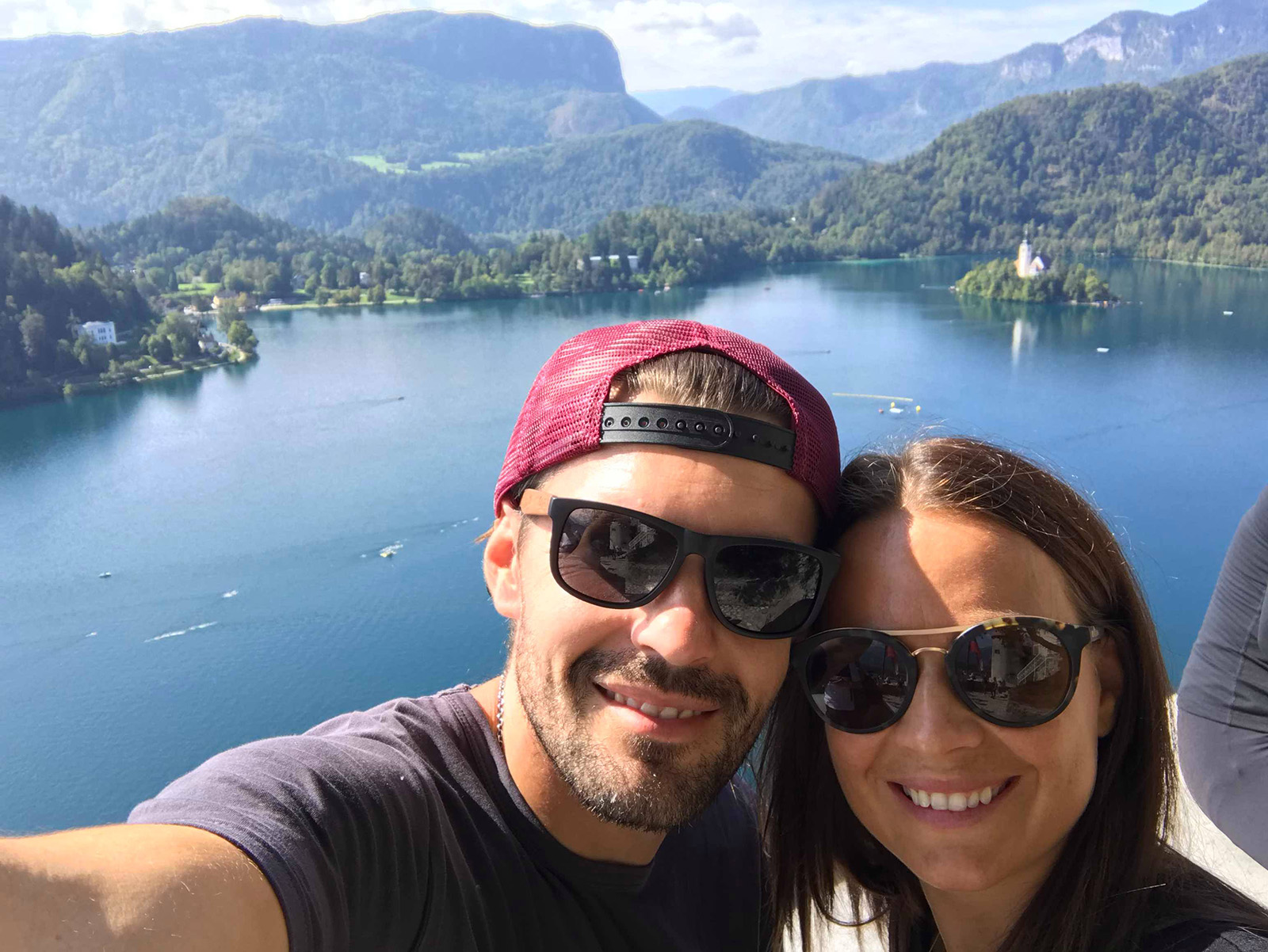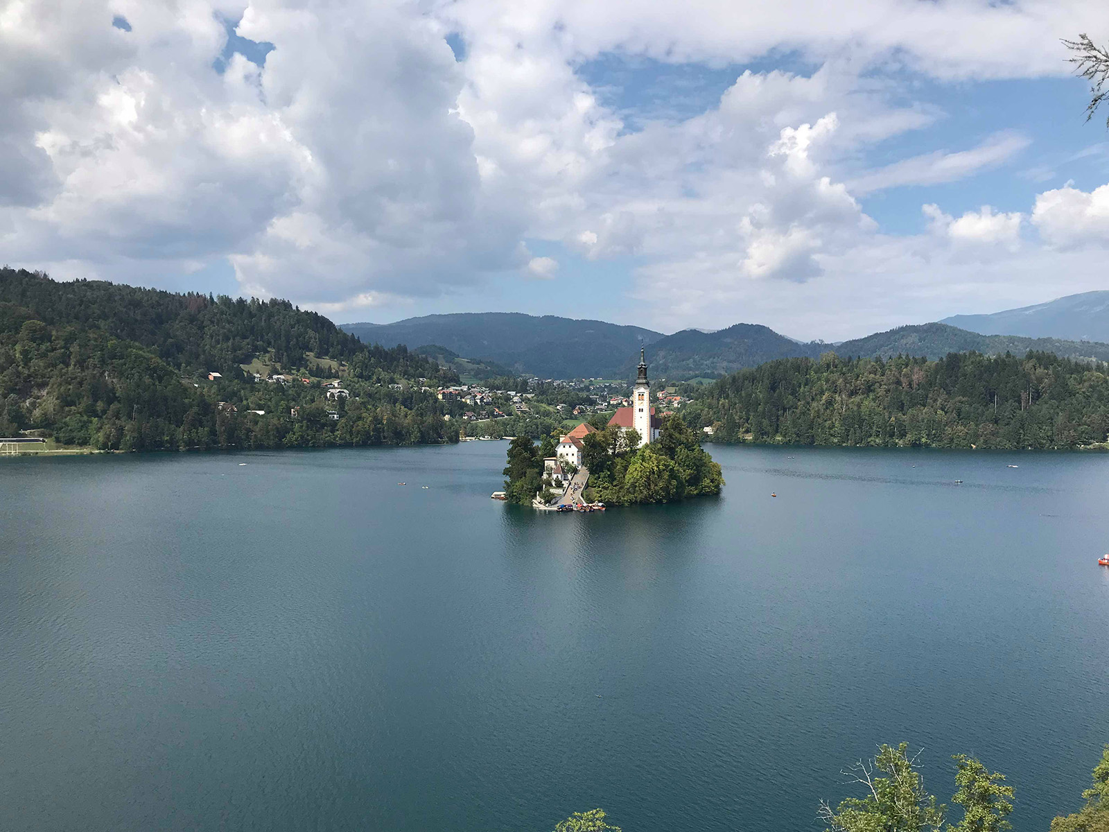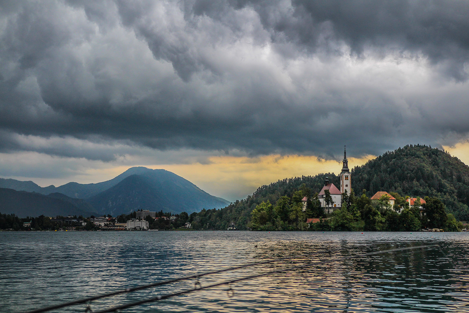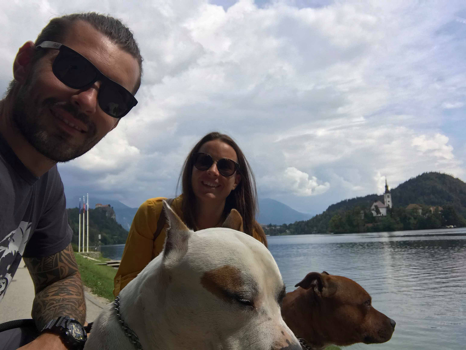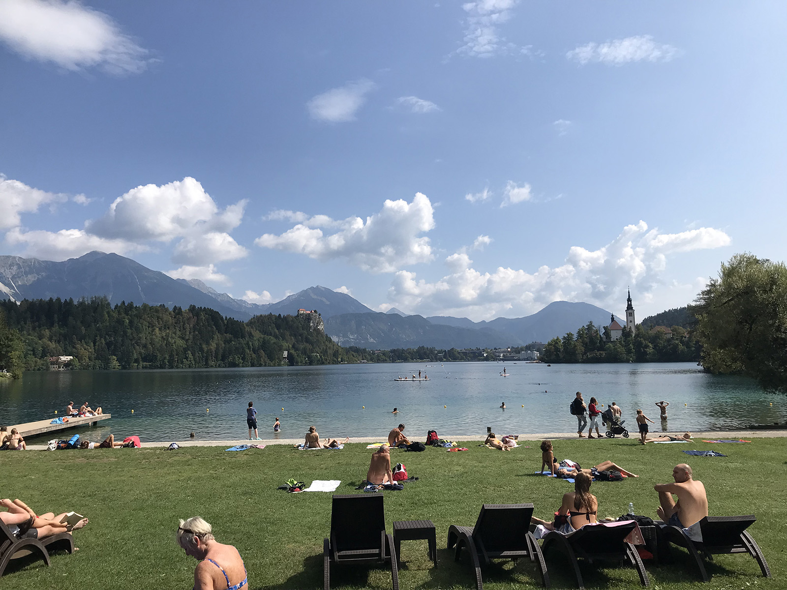 Hlídání zařízené, já vše zabalené a může se vyrazit. Cesta do Slovinska utekla strašně rychle. My se ani nenadáli a už jsme stáli na břehu tohoto horského jezera. Okamžitě nás odzbrojují dominantní vrcholky Alp, které z nás dělají malinkaté blešky. Nádherně čistá voda, přímo vybízí ke koupání a díky vyvěrajícím termálním pramenům je voda i překvapivě teplá. Ubytováváme se v kempu Bled. Musím vyzdvihnout luxus, se kterým se v tomto zařízení setkáte. Neustále čisté toalety, krásné sprchy, přípojky na elektriku, pro milovníky luxusu chatky s vířivkou a hlavně neustále usměvavý a ochotný personál.