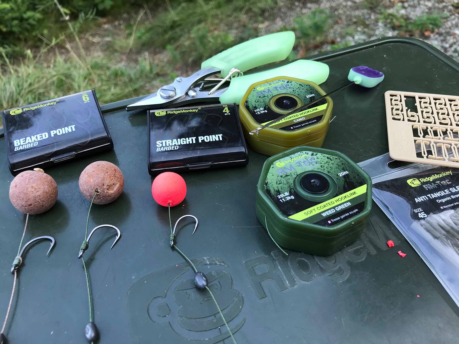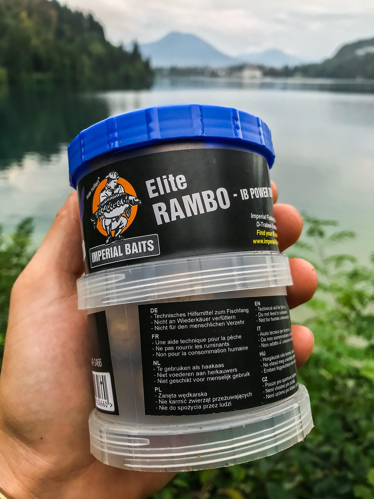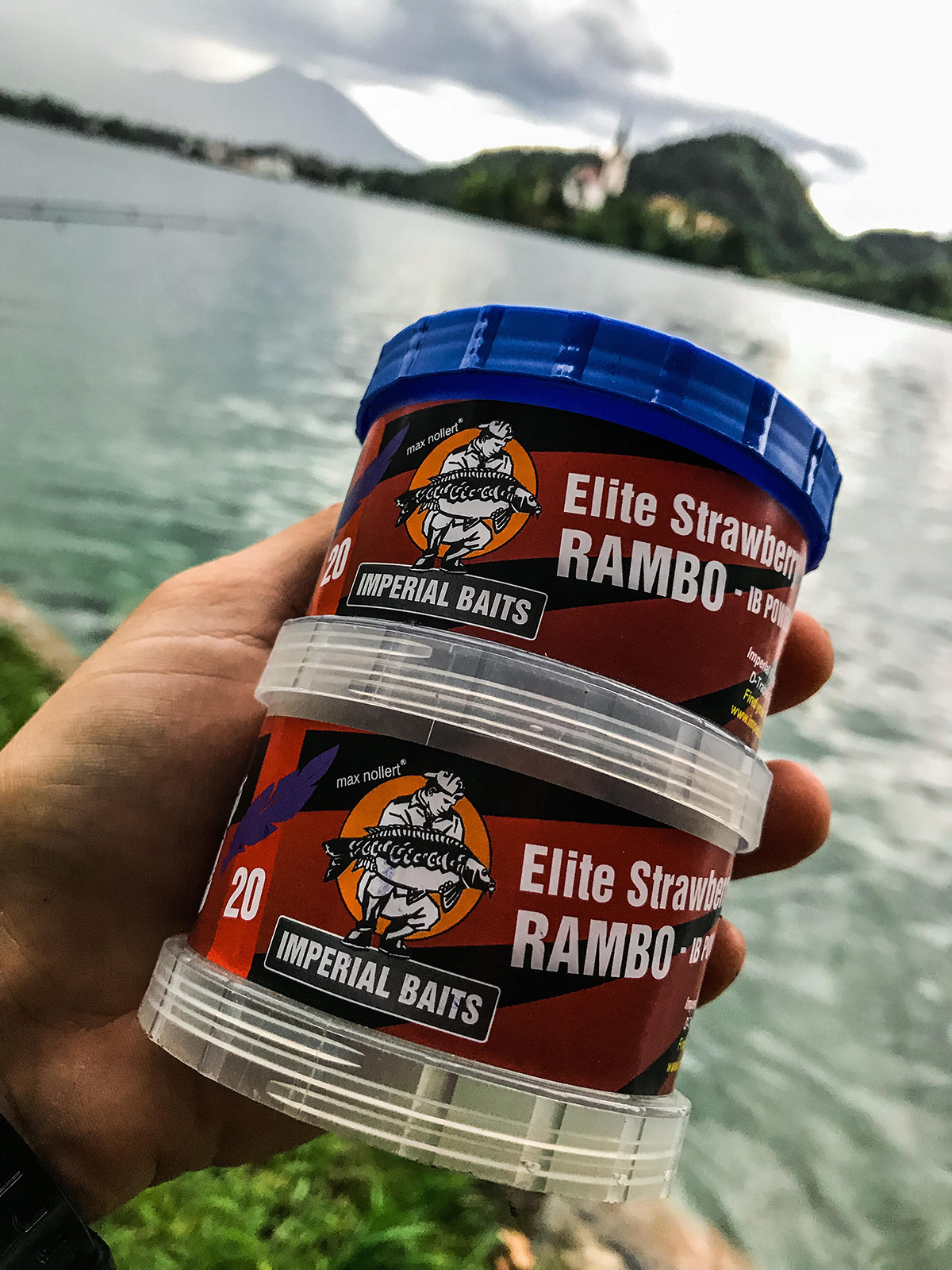 Vzdálenější prut chci udělat co nejatraktivnější, proto zde budu krmit menšími dávkami až do setmění. Krmím zde boiliesem Banana o velikosti 20mm, přelité Aminokomplexem a zasypané Powderem. Pod háček dávám boilies stejné příchutě i velikosti, ale ve verzi Rambo, ještě přelité esencí Banana a NHDC. Tohle odlehčené a tvrdé boilies je opravdovou zbraní na všechny velikosti kaprů. Na druhém prutu se pokusím vše přizpůsobit ulovení velké ryby, proto krmím vždy jen jednou a větším božstvím nijak neupraveným 20mm boiliem EliteStrawberry a pod háček používám boilie Rambo opět stejné příchutě i velikosti, jen už bez esencí.