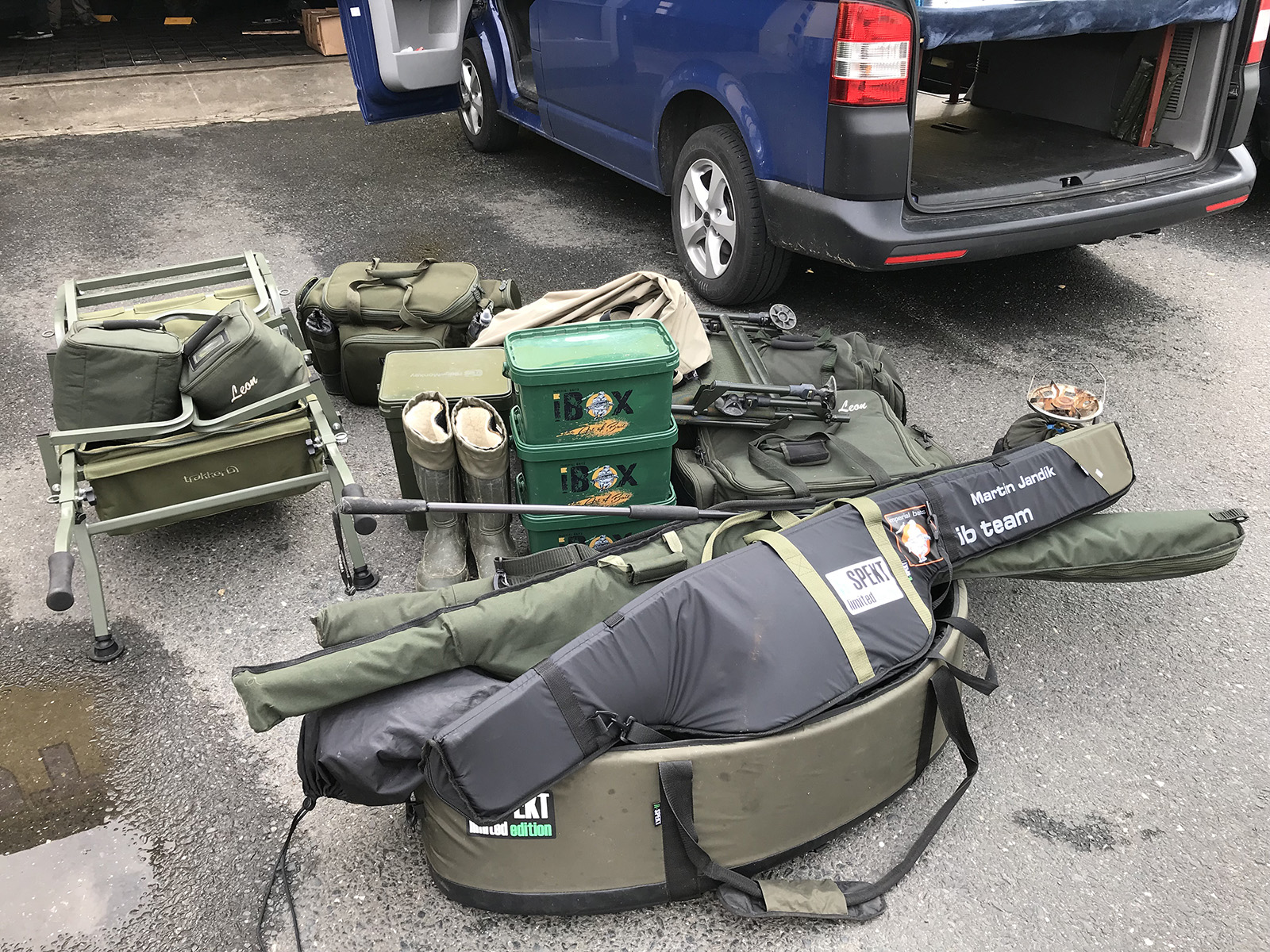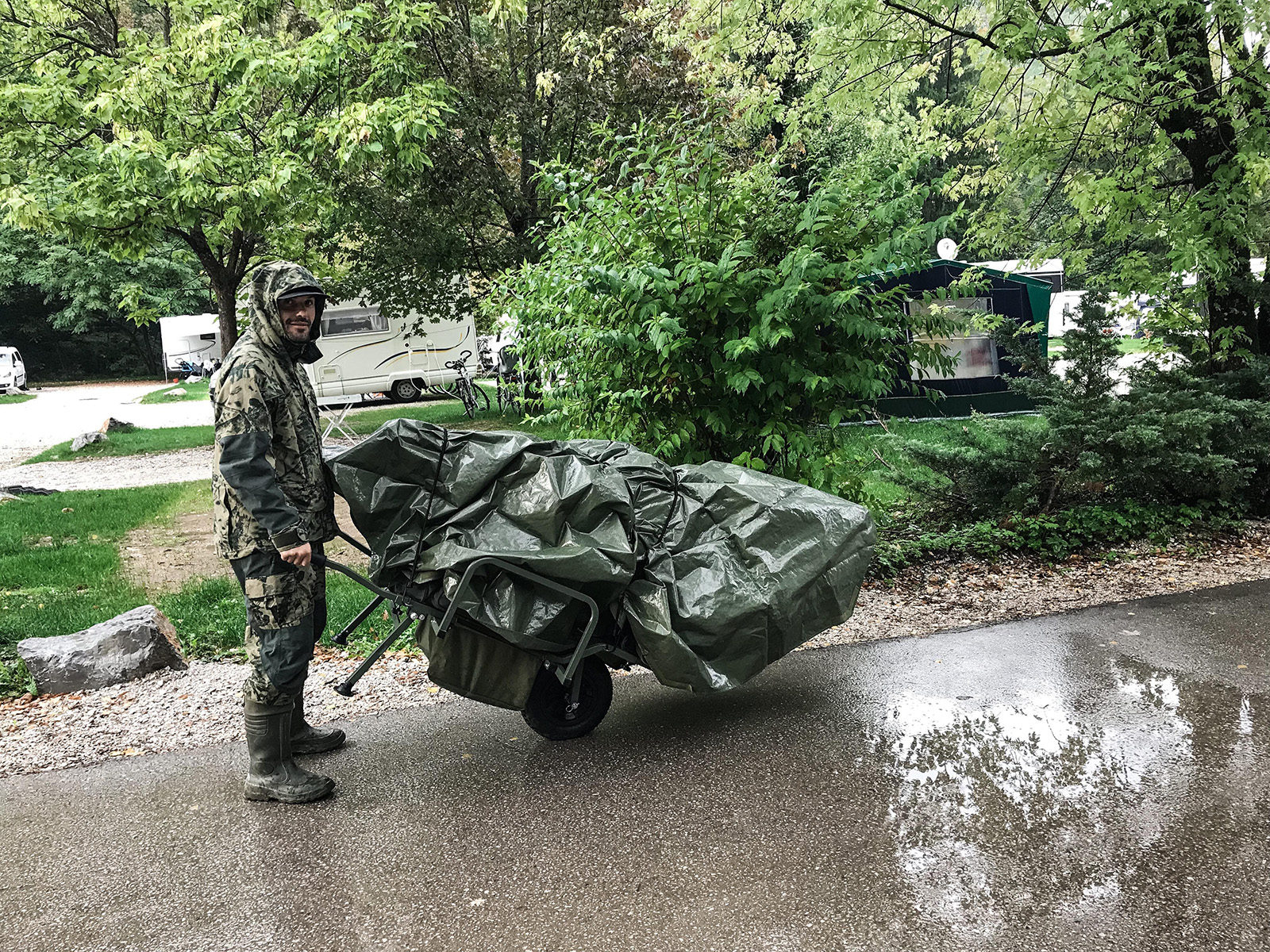 Slušně už nějakou chvíli prší, takže natahuji Geoffa a vyhlížím parťáka. Konečně je tady a náš konvoj může vyrazit. Nové místo je poměrně daleko a cesta s vrchovatým vozíkem těžká. Ale ani jeden na sobě nedáváme únavu znát. Touha po ulovení trofejního kapra, nás žene vpřed. Jsme na místě.