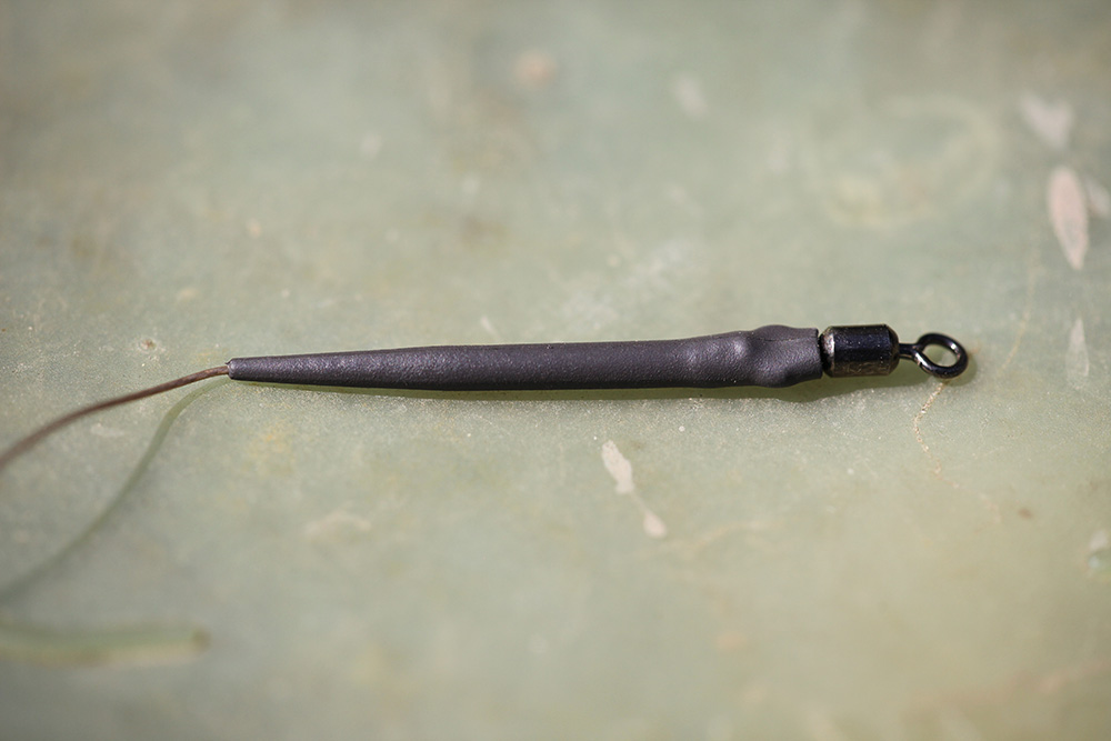 Má druhá sestava je závěsná tuhá montáž – hinged stiff rig, která spojuje návazec a chod rig, a je to taková úprava, kterou preferuji nad jemným bahnem nebo dnem s jemnými částečkami. Bužírka a systém lead klipu jsou totožné jako při montáži pro potápivé boilies s 6 až 8 palci potahované šňůry. Chod je následně navázáno na druhý konec v kombinaci s pop up boilies a vyváženo wolframovou pastou.