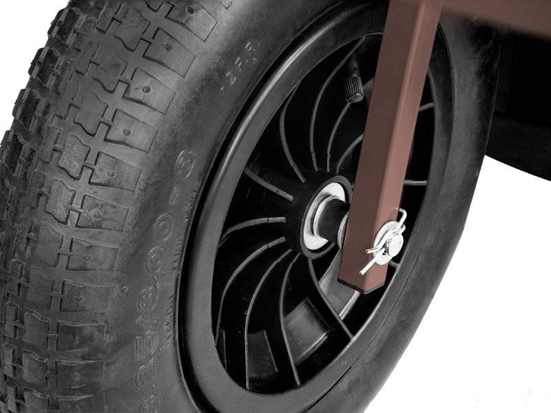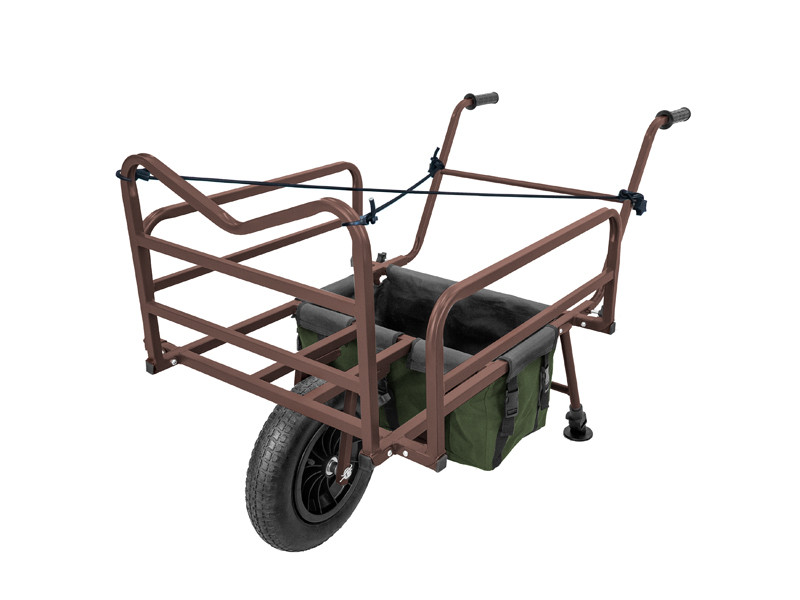 Velkorysá úložná plocha poskytuje dostatek prostoru i na naložení produktů s velkými transportními rozměry jako jsou lehátka, či křesla. Po bocích je vozík opatřen masivními bočnicemi, které se postarají o to, že všechny naložené věci zůstanou na svém místě. Přední bočnice je dokonce vyvýšená, a tak ještě lépe zabraňuje pohybu naložených věcí. Přispívají k tomu také dva gumové, délkově nastavitelné popruhy dodávané spolu s vozíkem, které umožňují dokonalou fixaci přepravované výbavy. Vozík disponuje velkým, širokým kolem s dezénem, díky kterému si poradíte i při přechodu těžkým terénem, nerovnostmi či blátem. Kolo je ke konstrukci vozíku upevněno pomocí šroubů a po použití jej lze demontovat, což přispívá k menším transportním rozměrům.